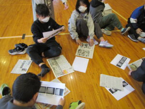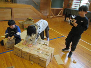避難所生活をする上で、身近にある新聞紙やキッチンペーパーを活用したスリッパやマスク作りや、段ボールベッド作りを行います。