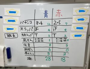 参加者たちを赤、青二チームに分けて、前半部分は、パチンコ玉キャッチ、スリッパ飛ばし、紙コップ飛ばし等のミニスポーツを行いました。 ヾ(@⌒ー⌒@)ノ