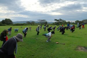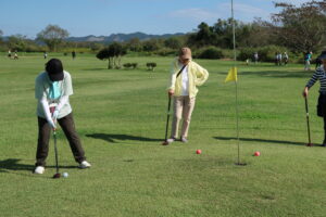 パークゴルフはゴルフよりも運動量が軽く、年齢や経験を問わず気軽に楽しむことができます。2年生が1年生に教えたり、よりプレーの上達を意識したりと、1・2年生が交流を深めることができました。 |