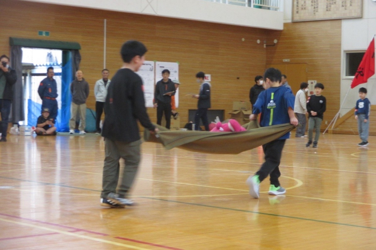 ▲ 防災運動会の様子(あつまれちびっこ) ▲ 防災運動会の様子(タンカリレー)