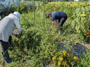 ボランティア友の会の皆さんが、不定期で草取りや水まきなどの畑の管理をしてくれています。このプロジェクトを盛り上げるため、ボランティア友の会の皆さんからの提案でお花を植えてみるなど、利用者や地域住民が楽しめるよう日々試行錯誤しています。