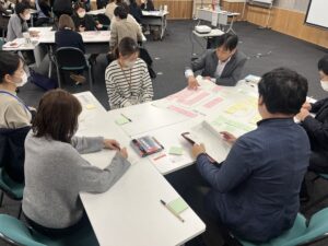 後半は、2つのテーマ(①地域学校協働活動での課題について ②日頃の学校や地域団体とのつながりについて)で、グループワークを行いました。その後の意見交換では、学校と地域の関係団体がそれぞれ、まずは地域資源を知ることが大切であること、お互いの想いや求めていることを知り、一緒に手法を考えていくことが必要であること等の声が多くありました。